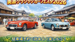 美濃クラシックカーフェスタ2026のアクセス・交通規制・駐車場情報を徹底解説。公式駐車場(akippa)や軒先パーキング、得Pの予約開始時期や攻略法までまとめ、混雑を避けて効率よく楽しむコツを紹介します。